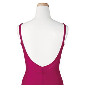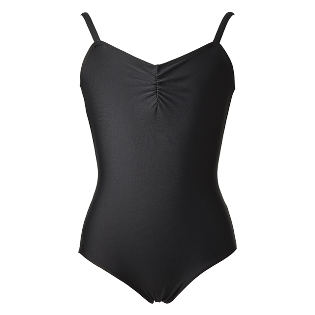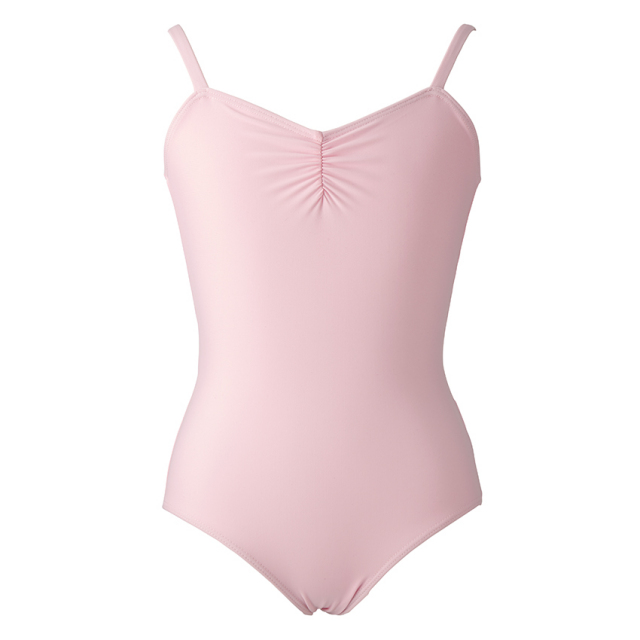 シャーリングのデコルテがキュートなキャミソールタイプのレオタード。