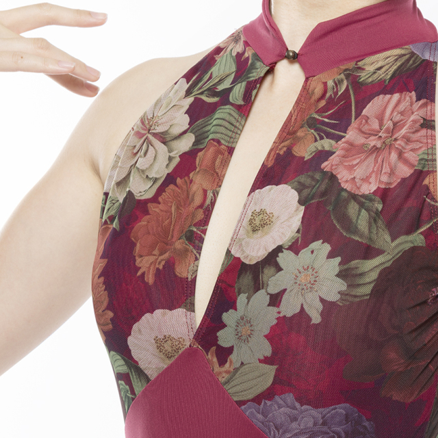 ボタンがついたユニークなフロントラインに、フラワープリントのメッシュを際立たせるスタイリッシュなシルエットが特徴的です。